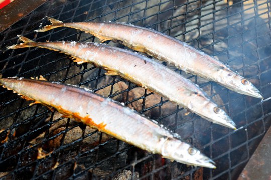 秋刀魚,意為秋季收獲的形狀像刀的魚,如其名字所示,是一種頗具秋季特色的美味。秋刀魚由于食用餌料后排泄較快,因此內臟帶有獨特苦澀味。經過鹽烤之后,可擠上略帶酸味的檸檬或是酸橙,抑或與白蘿卜泥一起,加上醬油、橙醋享用。秋刀魚營養價值極高,富含不飽和脂肪酸,蛋白質和鐵質,對心腦血管有益,因此日本有「秋刀魚が出ると按摩が引っ込む(秋刀魚出,不用按摩)」的說法。>>>>