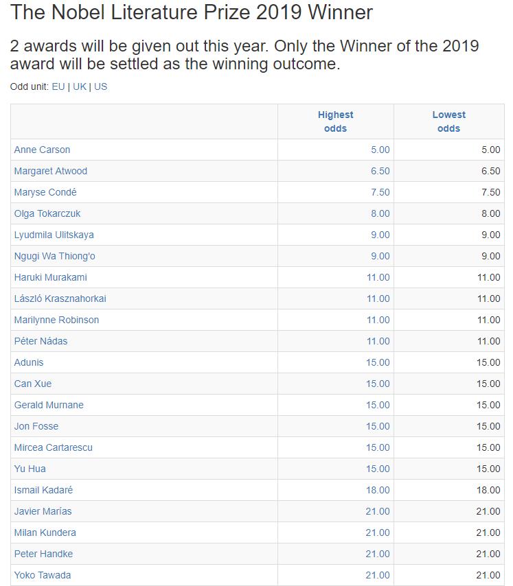 目前排名第一位的是加拿大女詩人安妮·卡森,中國作家殘雪、余華、楊煉也榜上有名。值得一提的是,今年的諾貝爾文學獎預測人選中,有多名為女性作家。(編譯:袁蒙 審稿:陳建軍)