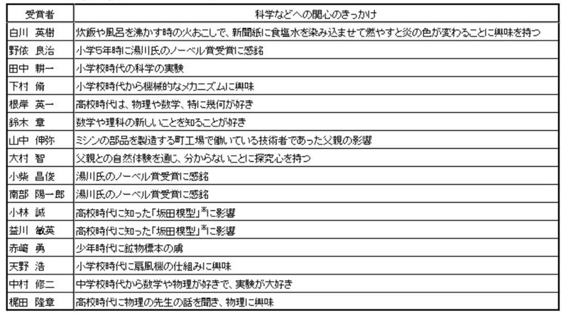 據分析認為,多數諾貝爾獲獎者對制作、實驗、自然結構表現出較高程度的關注,如田中耕一和梶田隆章均在校園生活中萌生了對自然科學的興趣。而野依良治、小柴昌俊、南部陽一郎則是受到諾貝爾獎獲獎者的影響。