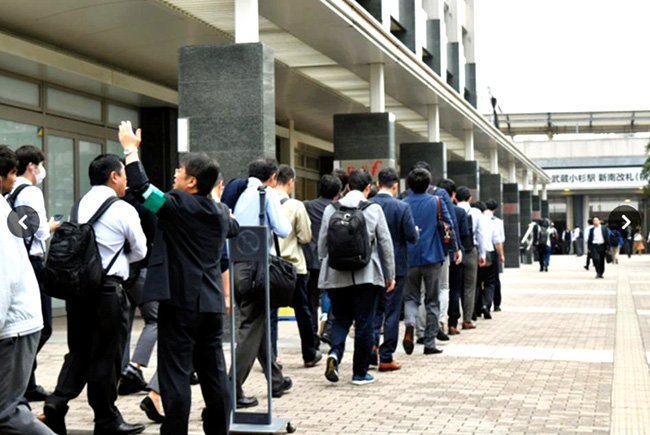 JR武藏小杉站外,乘客排起長隊等待進站。(圖片來源:日本《朝日新聞》網站)