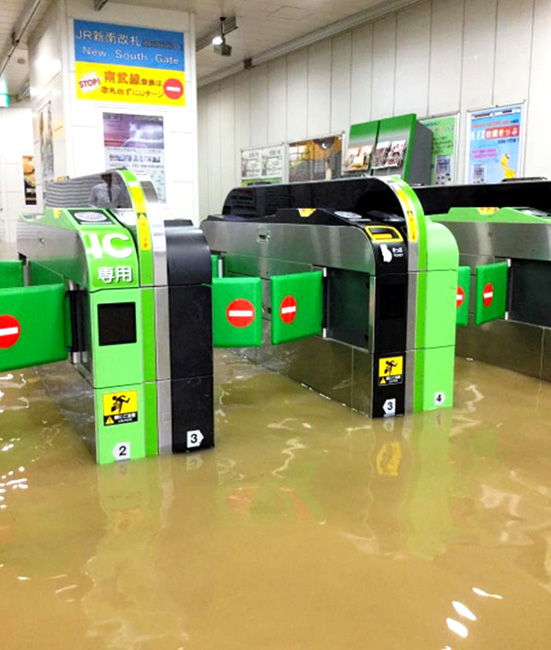 13日,因受19號大型臺風影響,JR武藏小杉站的自動檢票機被水淹沒。(圖片來源:日本《朝日新聞》網站)