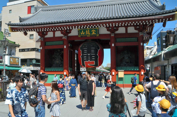 在雷門前牌照的外國旅客。(圖片來源:日本《朝日新聞》網站)