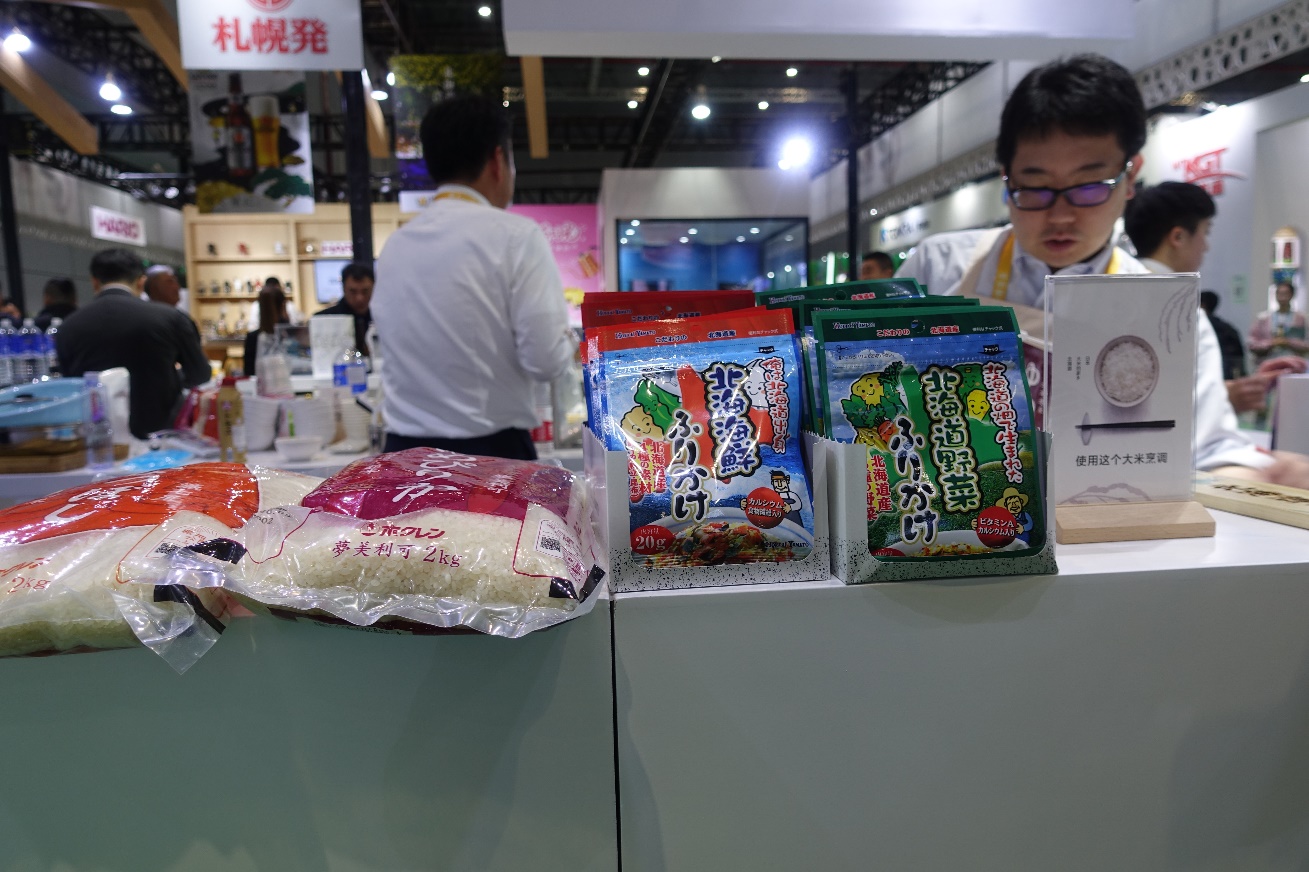 第二屆進博會8.2館北海道展區的展臺上擺放著日本大米和拌飯料。(人民網記者王曉霞攝)
