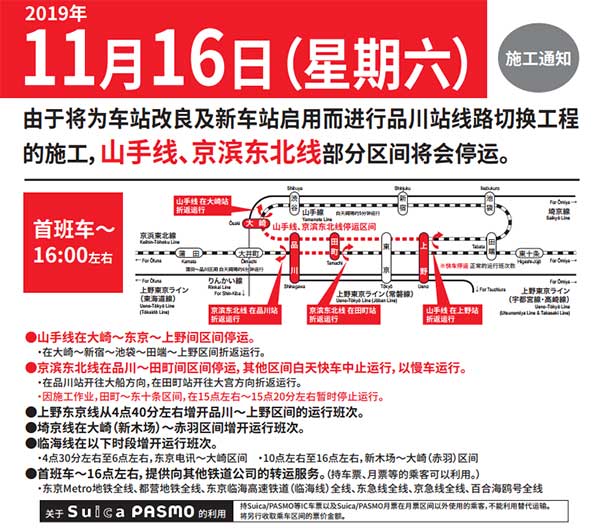 JR山手線的“大崎-東京-上野”路段將從16日首班車開始停運至下午4點,內環 “大崎-東京-上野”路段的班次縮減為平時的7成,下午6點將恢復全線的正常運營。