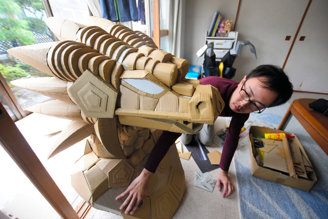 活動參加者山田光用紙箱子制作出怪獸的頭部。(圖片來源:朝日新聞網站)