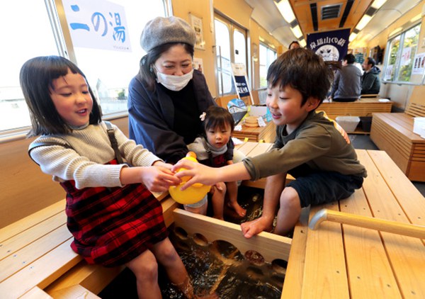 人民網東京12月2日電 據《朝日新聞》網站報道,日本近畿鐵道11月30日起推出了“足湯列車”。為紀念湯之山溫泉開湯1300周年,“足湯列車”于去年首次亮相,今年是第二次。車廂里設置了由檜木制作而成的足湯,列車運行時將引入沿線的菰野溫泉的溫泉水。