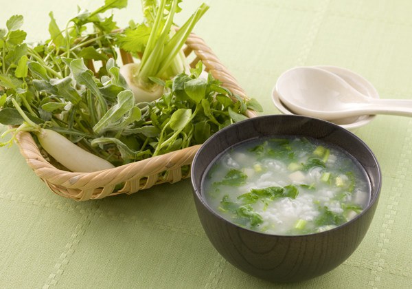七草粥是將白粥里加入春天的七種野菜熬制而成,這七種野菜分別為芹菜、薺菜、鼠曲草、繁縷、稻菜、蕪菁和蘿卜(セリ、ナズナ、ハハコグサ、ハコベ、ホトケノザ、スズナ、スズシロ)。>>>>(策劃/袁蒙)