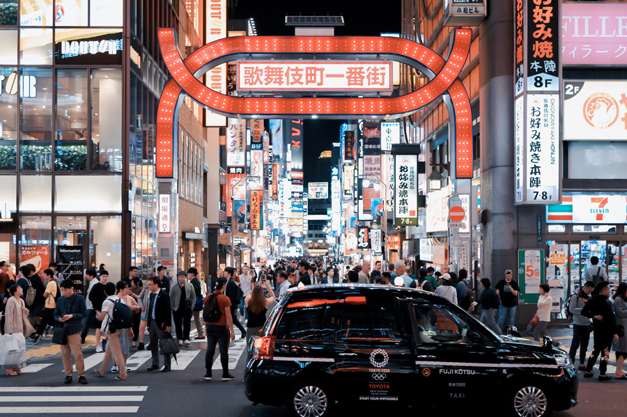 “熱鬧的新宿歌舞伎町,人來人往,經過的出租車上可見東京2020奧運會的字樣,向大家宣傳著這個城市將迎來全球矚目的奧運盛事!