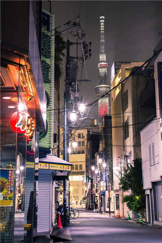 “避開游人必經的道路,換來一份靜謐。商店的各式招牌透露出生活的氣息,身后高聳的晴空塔與之形成了微妙的對比。而塔身上滾動的“東京2020”字幕更提醒著明年此時此地將舉辦的一場盛大的人類集會!