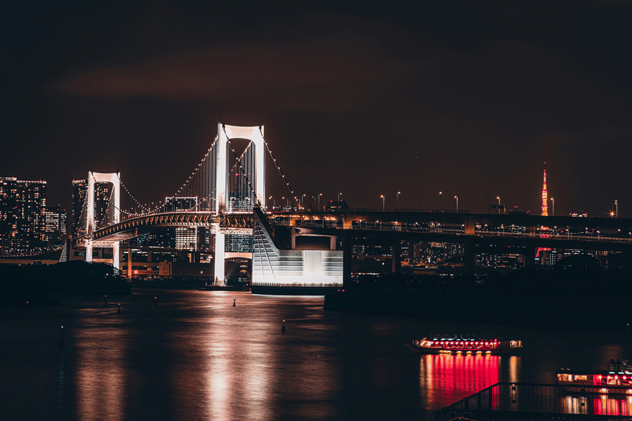 “入夜的臺場,能眺望遠處的彩虹橋及東京鐵塔,安靜的海面讓人放緩腳步,平靜的享受著秋天的微風!