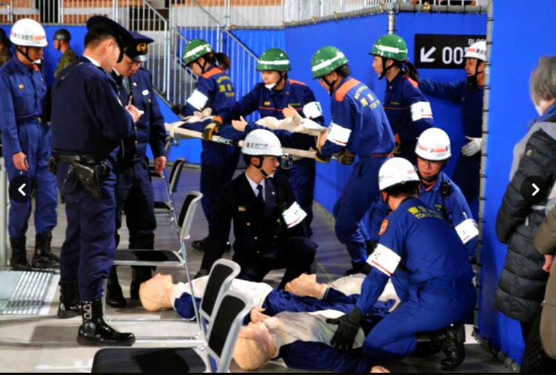 有明體操競技場內,各單位配合進行搶救受傷民眾的訓練。(圖片來源:日本《朝日新聞》網站)