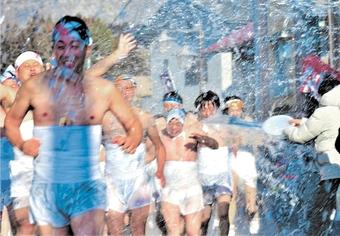 大約有270人參加“潑水節”,接受了冷水的洗禮。參加者腰纏白布、腳穿草鞋在500米長的商店街奔跑著穿過一道道水霧,路兩邊兩旁的路人會用木桶和臉盆潑灑大量的涼水,男子們在奔跑時還會發出“嗷~嗷~”的聲音。