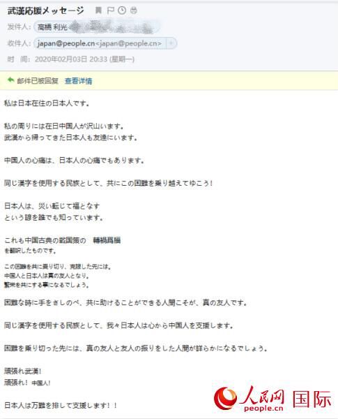 在不久前,人民網還收到了一位署名為“高橋利光”的日本讀者發來的郵件,他借用《戰國策》中的詞句,為武漢加油:“在日本,‘轉禍為!是人盡皆知的一句諺語。這句話源自中國的《戰國策》。這一次,日中兩國民眾如能攜手共同攻克難題,將成為真正的朋友,共享繁榮!薄凹佑臀錆h!加油,中國人!日本人將排除萬難,支援中國!”