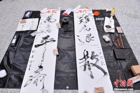2月9日,日本書法家、篆刻家鈴木啟義在東京街頭揮毫潑墨,寫下“難病退散,萬病平愈”為武漢祈福。 中新社記者 呂少威 攝