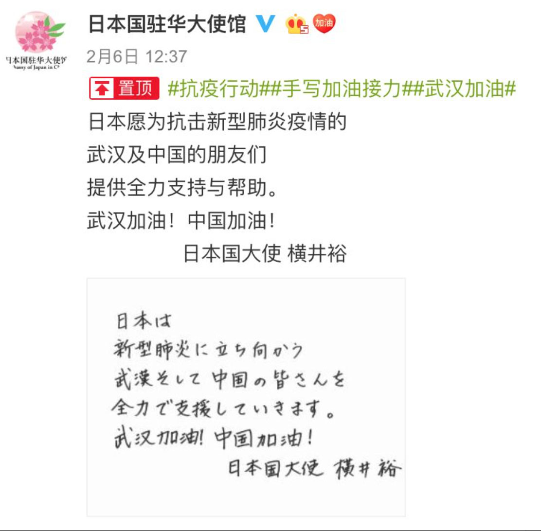 日本駐華大使館2月6日在官方微博上發表了日本駐華大使橫井裕的親筆信: