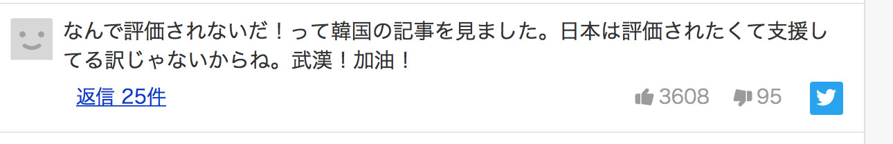 對于日本的善意,多家中國媒體進行了報道,外交部發言人華春瑩也在記者發布會上對日本表達了謝意。這份感謝之情也經日本媒體傳達到了日本國內,日本放送協會(NHK)、《朝日新聞》《日本經濟新聞》等多家媒體對此進行了報道。在雅虎日本網站刊登的日本朝日電視臺一則題為《中國報紙用一整個版面報道日本支援武漢》的新聞下面,有這樣一條網友評論,獲得的點贊數量最高: