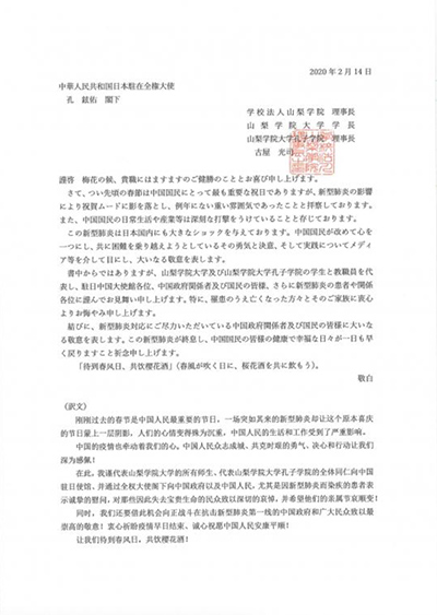 山梨學院大學理事長兼孔子學院理事長古屋光司2月13日分別向中國駐日大使館、中國孔子學院總部以及西安交通大學發出慰問信,對中國抗擊新冠肺炎表示聲援與支持。(日本孔子學院協議會供圖)