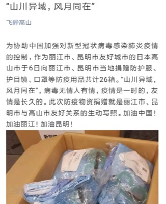在“飛驒高山”微信公眾號上,高山市發表文章《山川異域,風月同在》:“病毒無情人有情,疫情是一時的,友情是長久的”