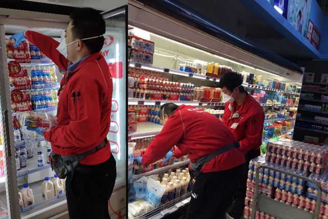 送貨人員嚴格佩戴口罩、手套為超市供貨(北京養樂多供圖)