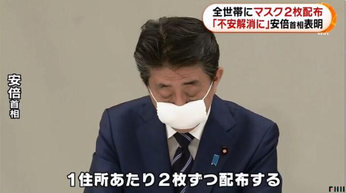 4月1日,日本首相安倍晉三表示,將在日本全國范圍內配發棉布口罩,配給量為每戶兩個。(圖片來源:日本富士電視臺視頻截圖)
