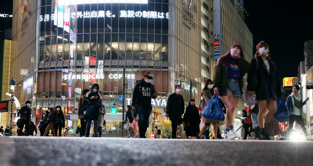 人們走過東京·澀谷站前十字路口的大屏幕。(圖片來源:日本《朝日新聞》網站)
