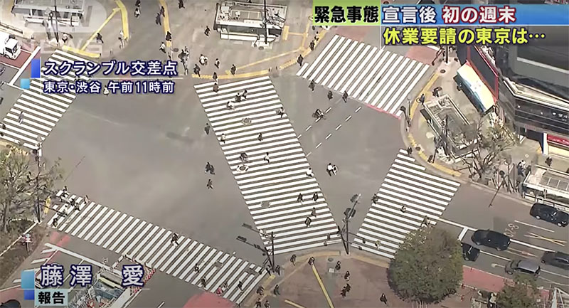 日本政府發布“緊急事態宣言”后第一個周末,東京澀谷站前人流量大幅減少。(日本《朝日電視臺》視頻截圖)