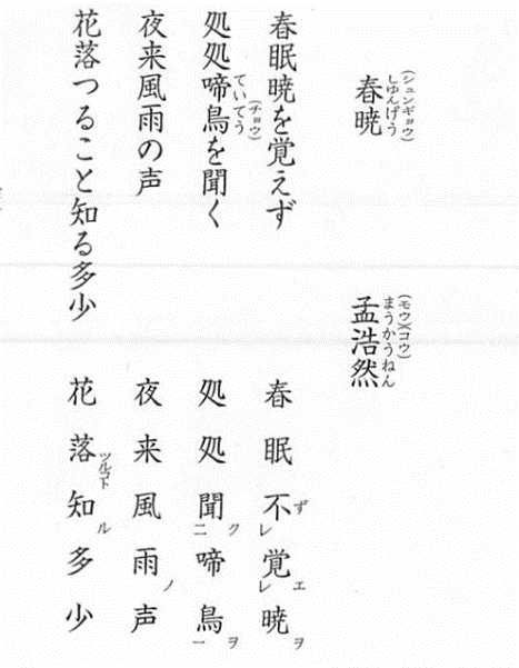 其實很多中國人可能還不知道,日本的義務教育中,古漢語是必修課。日本人從初中開始學習古漢語,圖1為初二學生“國語”教科書的一部分。仔細看上半部分的日語翻譯不難發現,動詞是倒置在句尾的。稍有日語學習經歷的人或許能看出這與現代日語略有不同。這是用日本的古文寫就的。下半部分有送假名(片假名)、漢字的讀音(平假名)以及改變漢字順序的符號(一二點和re<レ>點)。