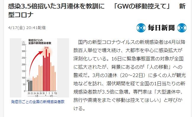 隨著因學校臨時停課而回家鄉的大學生不知不覺中將家人傳染的案例出現,面對黃金周的到來,日本各地提高了警覺,不斷呼吁在外工作的人或學生不要回家。