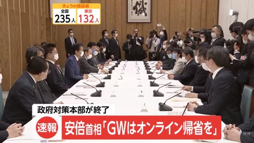 上圖:日本首相在22日的會議上呼吁民眾“在線探親”(來源:FNN電視臺報道截圖)