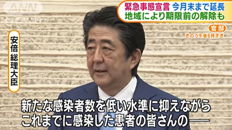 5月4日,日本首相安倍晉三宣布延長“緊急事態宣言”至月底(電視報道截圖)