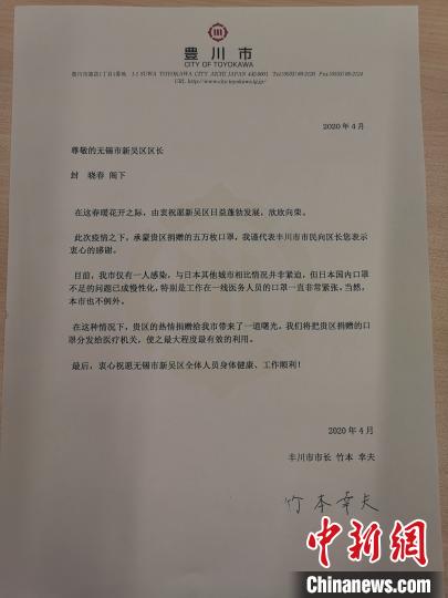 “貴區的熱情捐贈給我市帶來了一道曙光,我們將把貴區捐贈的口罩分發給醫療機關,使之最大程度、最有效的利用!痹谑盏綗o錫高新區捐贈的5萬只口罩后,日本豐川市市長竹本幸夫發來感謝信,信中,他衷心祝愿無錫高新區全體人員身體健康、工作順利。
