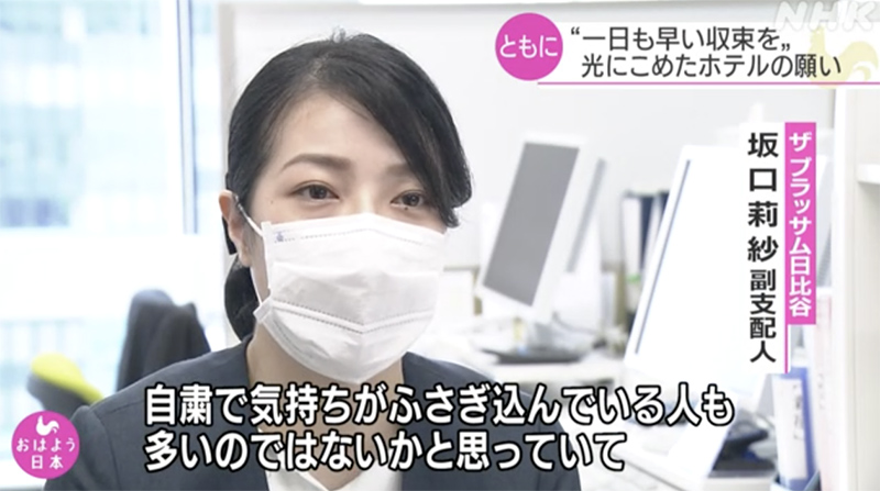 酒店工作人員坂口莉紗表示,防疫期間很多人情緒低落,希望能通過亮燈向人們傳遞勇氣。(NHK電視臺視頻截圖)