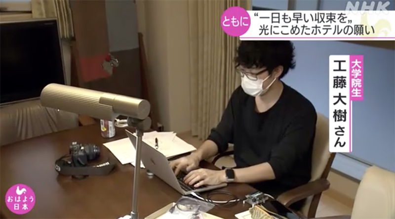 工藤大樹將自己設計的圖案通過郵件發送給酒店。(NHK電視臺視頻截圖)