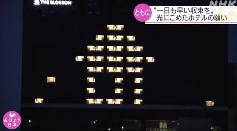 酒店采用工藤大樹設計的“家的形狀”圖案,呼吁民眾不要外出,居家自律防控。(NHK電視臺視頻截圖)