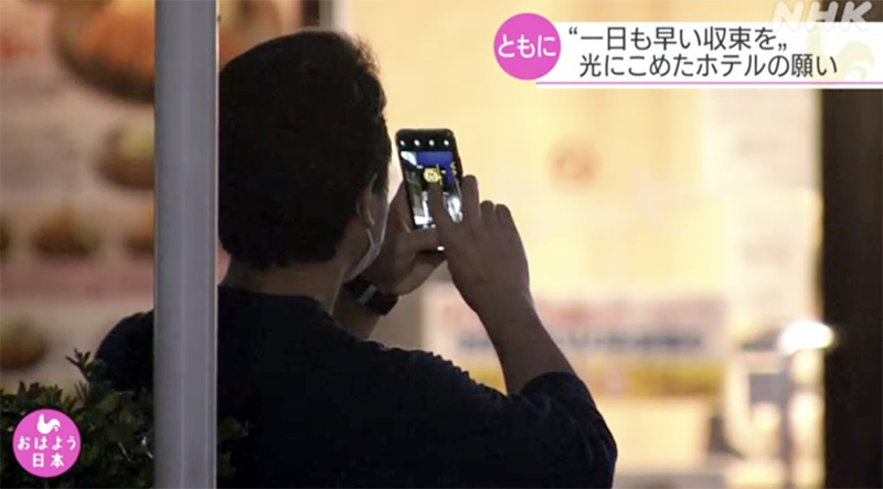 日本民眾用手機拍下酒店亮燈圖案。(NHK電視臺視頻截圖)
