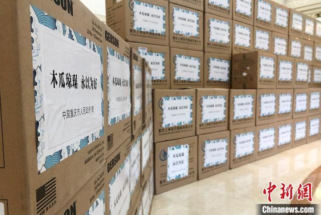 圖為重慶向日本友好城市捐贈的物資上張貼著“木瓜瓊琚 永以為好”的標語。 劉相琳 攝