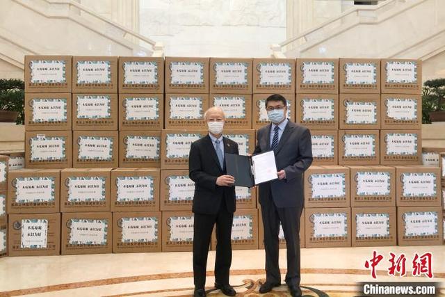 圖為重慶市政府外辦主任章勇武(右一)向日本駐重慶總領事館總領事渡邊信之轉交捐贈文書。 劉相琳 攝
