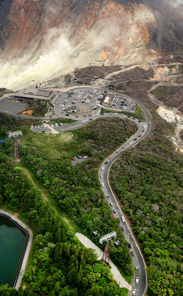 開往大涌谷停車場的汽車。(圖片來源:日本《朝日新聞》網站)