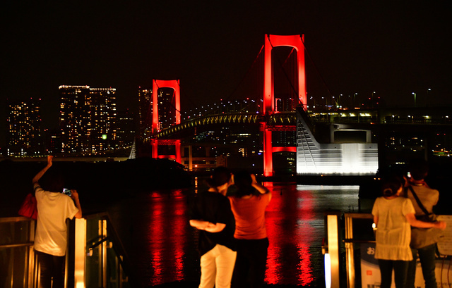 6月2日,東京都發出“東京警報”,彩虹大橋亮起紅燈。(圖片來源:日本《朝日新聞》網站)