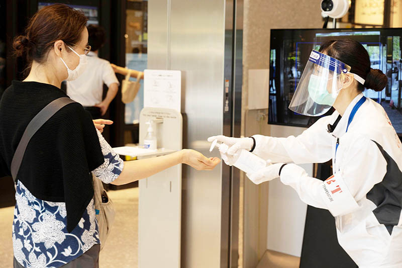 “虎之門Hills Business Tower”工作人員為每位顧客提供酒精消毒。(圖片來源:森大廈株式會社)
