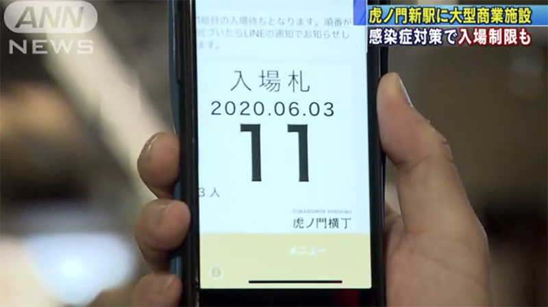 在用餐時間,“虎之門Hills Business Tower”的商家會向客人推送號碼牌進行分流,以避免群聚性傳染。(日本朝日電視臺視頻截圖)