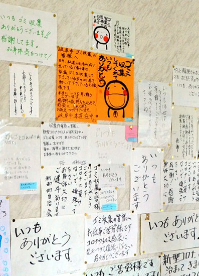 據岐阜市政府介紹,從4月下旬開始,垃圾袋上就開始出現寫有感謝詞的紙張或信件。有人寫信提醒回收員小心感染,也有一些小孩子把自己畫的圖畫送給回收員。還有人將自己親手制作的口罩送給他們。