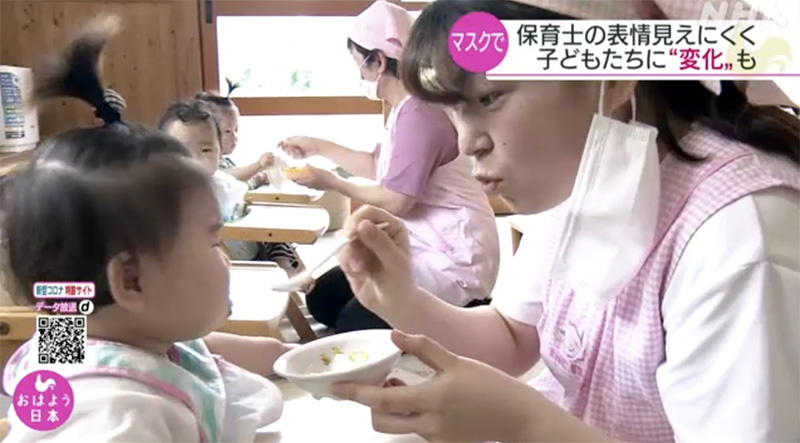 保育士佩戴口罩給幼兒喂輔食。(NHK電視臺視頻截圖)