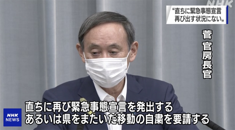 日本內閣官房長官菅義偉在6月29日上午舉行的新聞發布會上表示,目前尚無立刻再次發布實施“緊急事態宣言”的必要,也不處于要求限制跨縣移動的階段。(NHK電視臺視頻截圖)