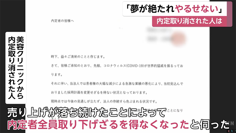 一位被取消“內定”的學生表示,公司因營業額持續下降,不得不取消之前決定的所有“內定”人員。(NHK電視臺視頻截圖)