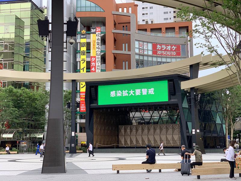 安置于池袋西口公園的大型屏幕顯示疫情加劇,提醒當地民眾注意防控。(暮雨 攝)
