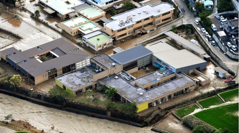 漲水的球磨川岸邊的一處養老院(出處:《朝日新聞》網站)