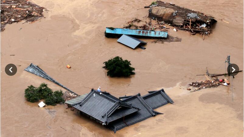 上圖:洪水幾乎要淹沒熊本縣人吉市的一處村莊。攝于2020年7月4日中午11點(來源:《朝日新聞》網站)