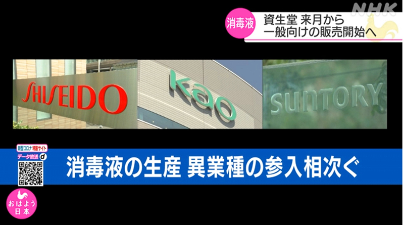 多家化妝品、日用品及造酒企業等開始生產消毒液。(NHK視頻截圖)