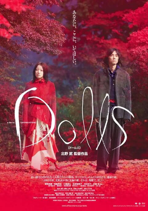 《玩偶》是北野武首部以短篇形式拍攝的電影:松本和佐和子本是戀人,松本卻與社長千金交好,拋棄了佐和子。深受打擊的佐和子精神崩潰,松本得知后來到醫院將她帶走,兩人彷徨出逃……年邁的黑幫老大來到了年輕時常與戀人相會的公園,重逢了癡心等待他的戀人……國民偶像春奈因遭遇交通事故隱退,歌迷溫井為了陪伴她甚至自毀雙目……三對男女悲戀與日本的季節變化交融,同時由山本耀司擔任服裝指導,影片畫面極具美感。